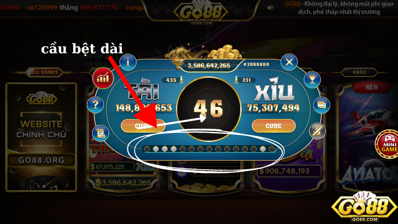 • Khái niệm cầu bệt: Cầu bệt ở đây được hiểu là khi tài và xỉu xuất hiện liên tiếp. Nếu bạn nhận thấy cầu bệt đang diễn ra, hãy đặt cược vào bên thắng.
